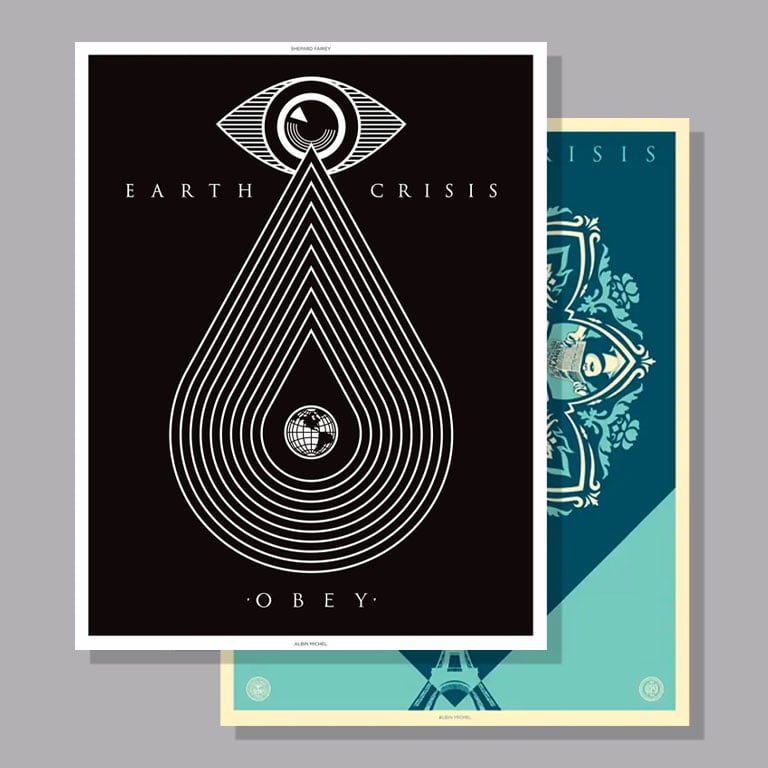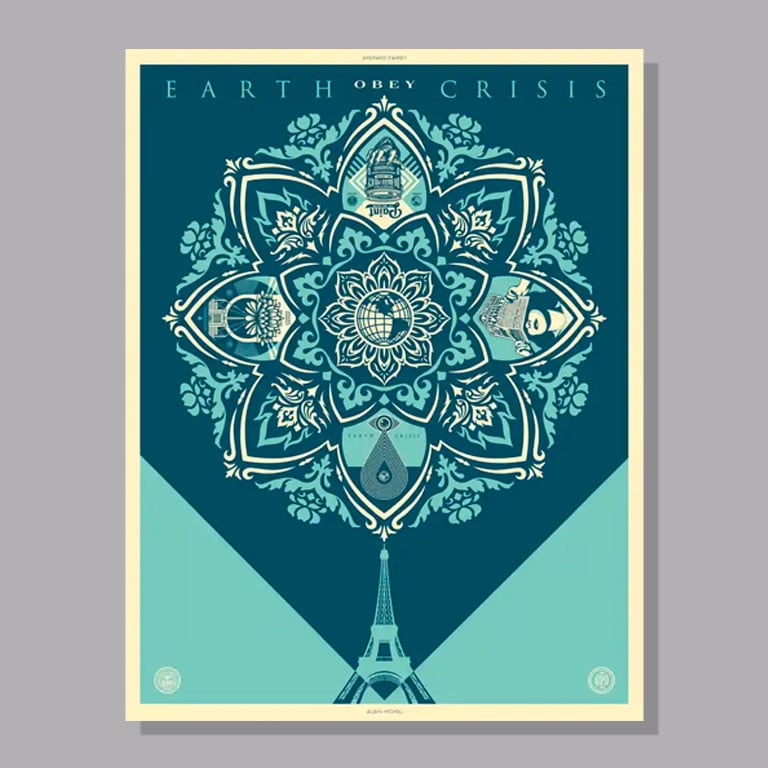 Shepard Fairey, Albin Michel Editions, and Galerie Itinerrance are delighted to present the spectacular and unique book-object that chronicles the artist's twenty-five years of fighting for the planet, culminating in the installation of the "Earth Crisis" globe suspended between the first and second floors of the Eiffel Tower. In this box set, you will find two large-format volumes, one of which is a "stand-alone" cardboard piece allowing you to display, at your choice, 10 reproductions of the artist's works.